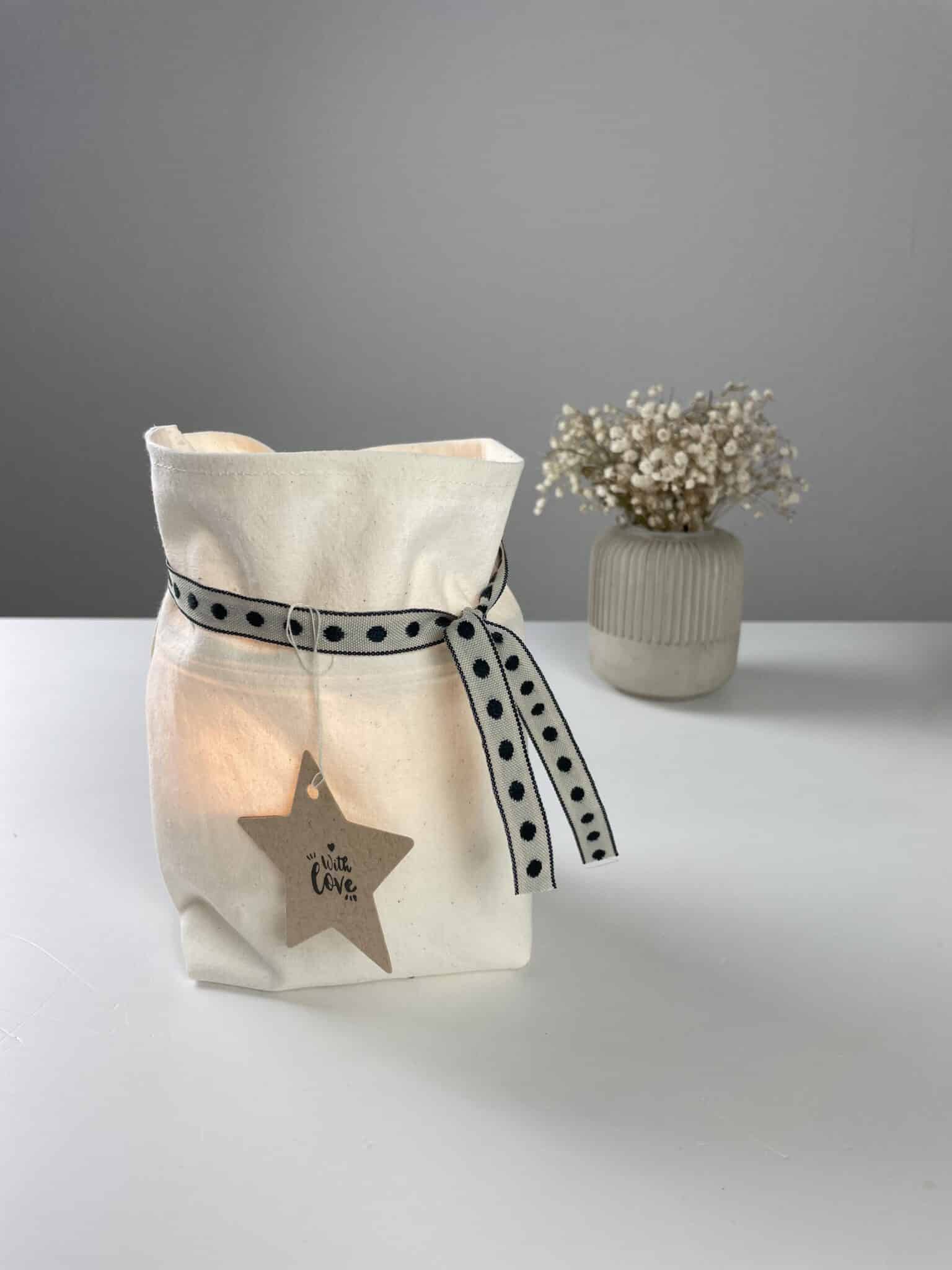 Die Adventszeit rückt mit großen Schritten näher und passend dazu habe ich heute eine kleine süße Deko-Idee für euch, die euer zu Hause mit warmen Licht in eine zauberhaft gemütliche Stimmung bringt. Diese Stoffbeutelchen lassen sich entweder mit kleinen Akku-Lichterketten bzw. Akku-Kerzen oder – noch viel schöner – mit echten Kerzen bestücken, die dafür aber zur Sicherheit in passende Gläser gestellt werden sollten. Natürlich lassen sich diese Beute mit Standfuß auch für andere dekorative Zwecke oder als Geschenkverpackungen nutzen und individuell nach euren Ideen gestalten.